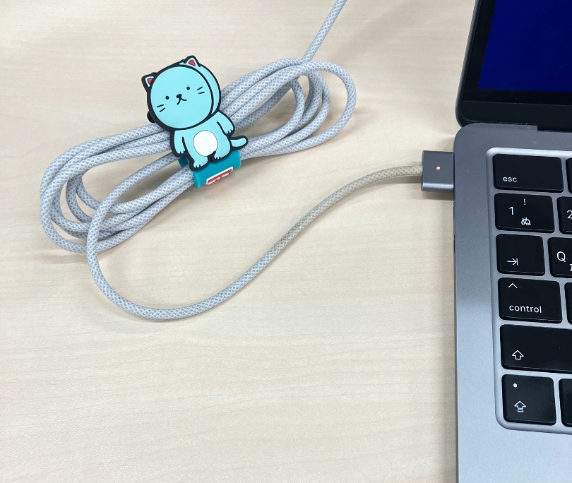イヤホンコードや充電ケーブルなどをまとめるのにちょうど良いサイズ感で、ラムねことしゅうチューのキャラクターが半立体で表現された樹脂製のケーブルホルダーとなっています。